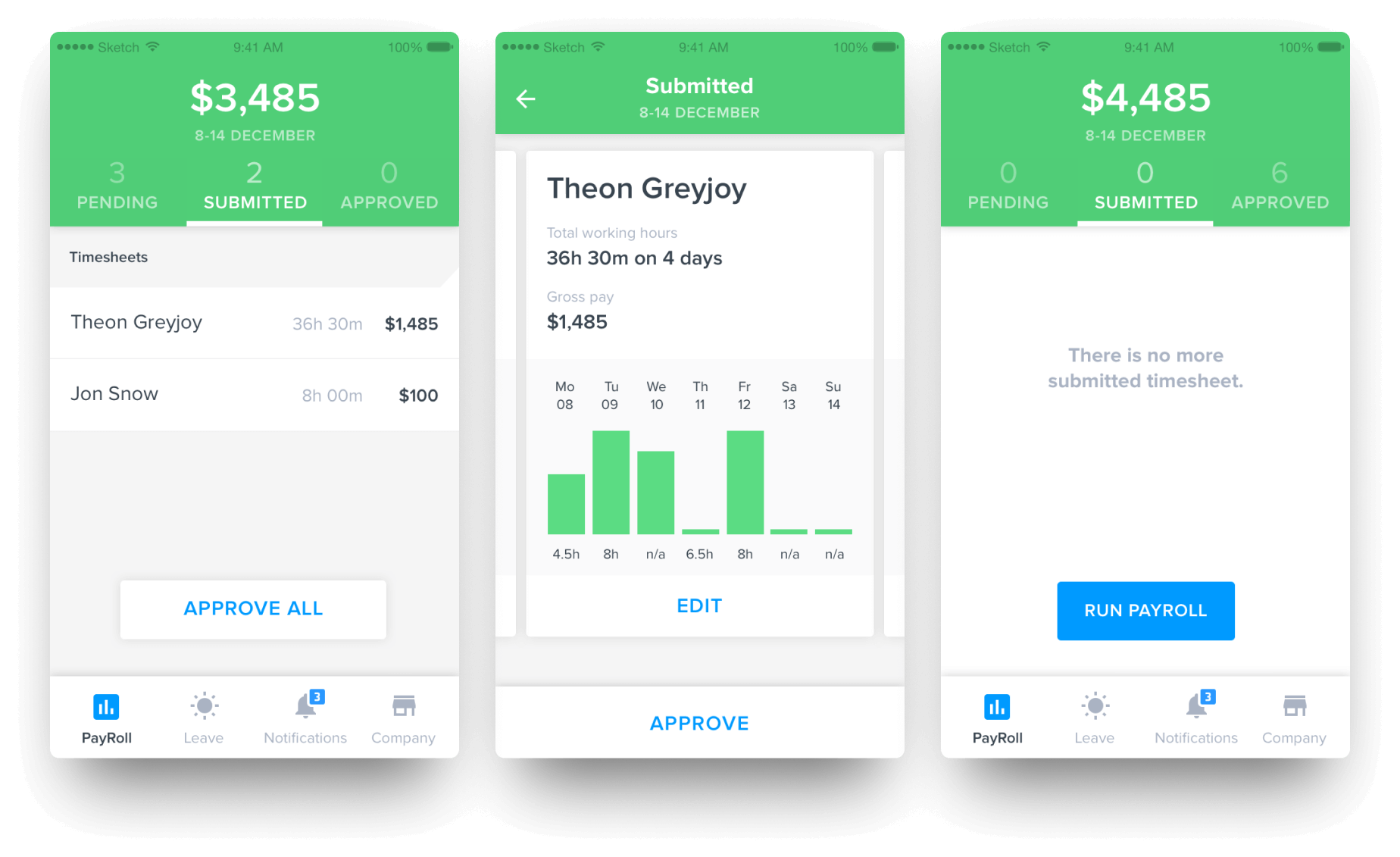 A payroll app for employees and managers. Employees can track their work and timesheet, ask for leave and reimbursements. Managers can overview timesheets, run the payroll, approve holidays and reimbursements.
